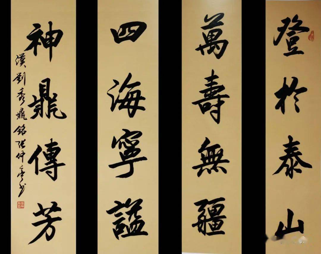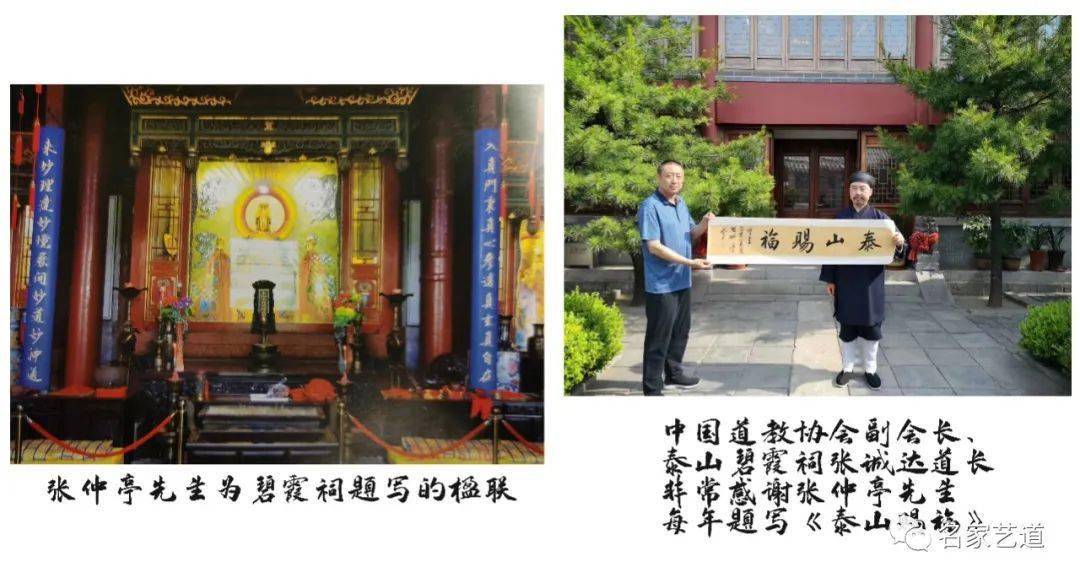 此后,与泰山相关的诗、词、文、赋、楹联等,成为张仲亭先生乐写不疲、常写常新的书法创作题材。他应邀为泰安的多处厅堂楼馆、名胜古迹题写匾额、楹联等。如他为泰山碧霞祠内书写对联:“入真门秉真心参透真玄真自在,来妙理达妙境展开妙道妙神通”,二十多年来被无数游客观赏咏读。他为岱庙灵侯殿书写楹联,为泰山国际马拉松题字-----