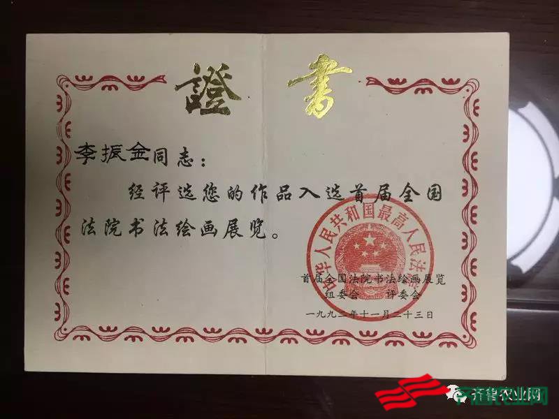 图为李振金同志作品入选全国法院书法绘画展览